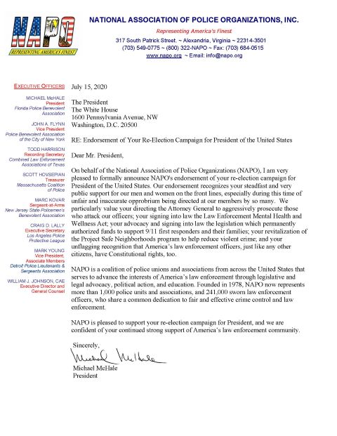 - Cops-The National Association of Police Organizations (police unions) endorsed Trump. They refused to give an endorsement in either 2012 or 2016. Trump will make the most of the Blue Wall who will doubtless be a key feature at Trump rallies going forwards. Considering how many accused felons I have gotten off the hook over the years, I make an odd celebrant of the police, but choosing between cops and rioters is an easy choice for me, and I suspect that it will be an easy call for most voters. A major, and overlooked, win for Team Trump.