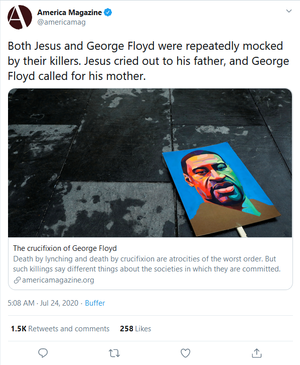 I can see a comparison between the Minneapolis police and the Roman soldiers who mocked Jesus. I doubt I’d agree with it, but at least I can see the analogy. Comparing George Floyd’s death to Christ’s self-sacrifice on Calvary in obedience to the Father’s will borders on blasphemy.