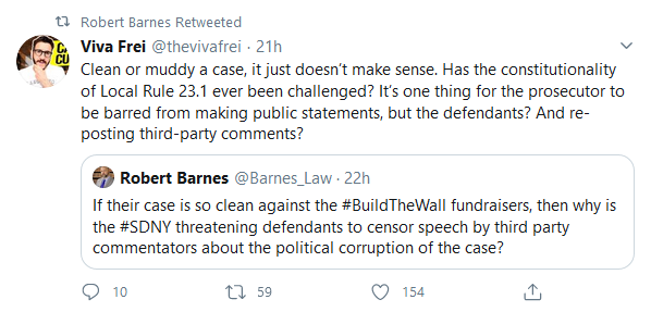 The Southern District of New York is now attempting to gag the Defendants from discussing the case. Sadly courts often do enter such orders even though they blatantly fly in the face of freedom of speech. The prosecution however will find that it is far easier to suppress the freedom of speech of the Defendants than it is to convict them,