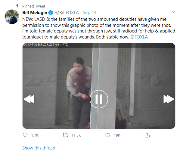 “He’s bleeding out profusely from the arm so she actually applies a tourniquet to his arm to stop the bleeding and she tries to call for help on the radio,” Villanueva explained. “It’s pretty heart-wrenching and she’s trying to mumble and we finally get her … she says where she is at and the fact that there was a shooting, and that got all the help rolling in her direction.”