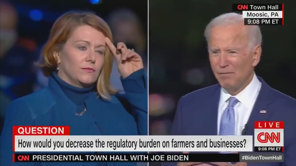 He just told her that her potato farm will be out of business if he gets elected. Between forcing her to let her land lie fallow, change from potatoes to politically approved crops or abandoning potatoes to now invest in a chicken shit operation, her family’s potato business is done. Or, did I miss something? It’s certainly possible, because he is demented.