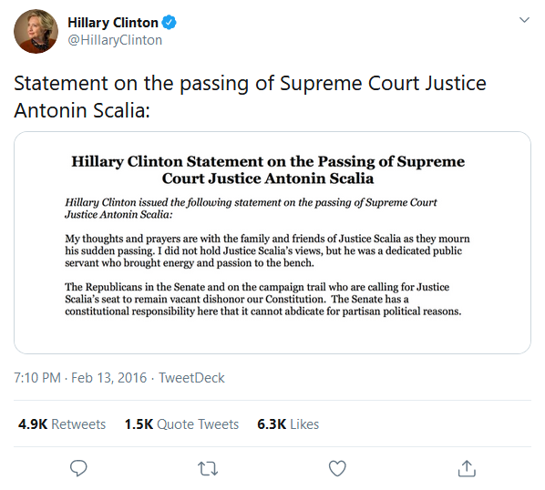 True – but the Republicans were saying the opposite as well. For every Democrat that said we shouldn’t wait (when Obama was the lame duck) there was a Republican who said we should hold off. Just proves that there is no integrity on either side (not that it should surprise anyone).