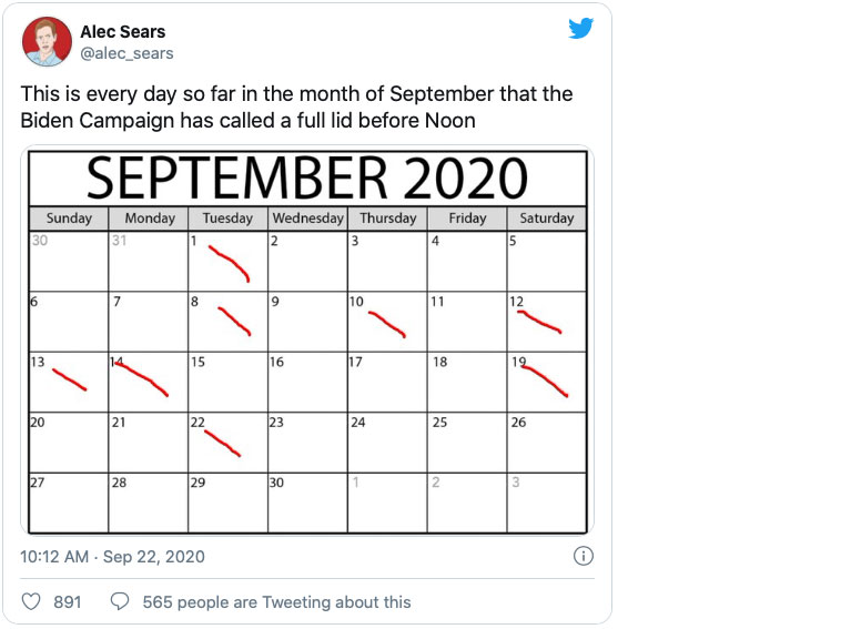 No wonder he routinely takes the day off after a day with one minor campaign event. He is in bad shape physically and mentally. Time to euthanize this sad farce of a campaign.