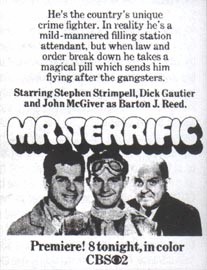 The things you find on the internet! A short lived television show, Mr. Terrific aired on CBS from January to August 1967.  It told the comic adventures of Stanley Beamish who, after taking a secret formula produced by government scientists, became the heroic Mr. Terrific. At ten years old, I loved it. Considering how quickly it was cancelled I was part of a select audience. Part of the jingle that opened the show has remained with me over half a century: