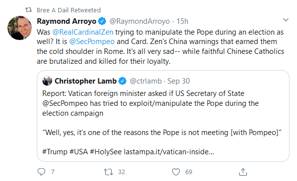 The Pope seems to have no problem with throwing faithful Catholics under the bus – whether in China or the US. His refusal to meet with Cardinal Zen is totally inexcusable – what is he afraid of? That he refused to meet with US Secretary of State, Mike Pompeo is just plain rude.