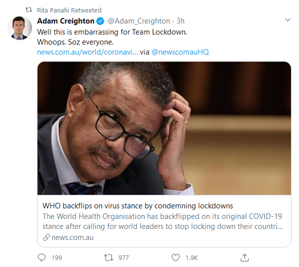 The World Health Organisation has backflipped on its original COVID-19 stance after calling for world leaders to stop locking down their countries and economies.