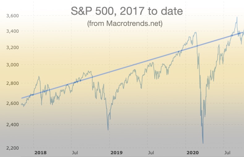The sharp dip in the S&P 500 index, March/April (featured image) corresponded to the start of the covid-19 panic.   My retirement IRA tanked then, but has recovered somewhat to date.  Since that time the market has fluctuated up and down, but with an overall rise, as the featured image shows.