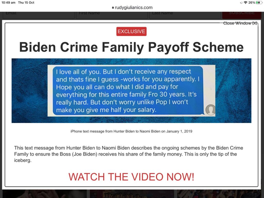 The message, Giuliani said Wednesday on his “Common Sense” video podcast, showed members of “the Biden crime family” were to give half of their profits to “pop,” Joe Biden.