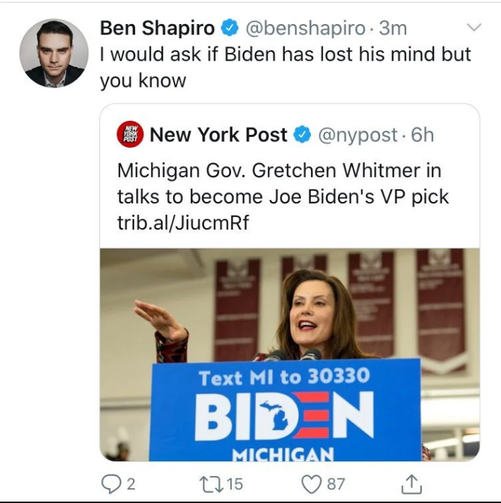Shapiro gets it from both sides. Trump voters are often angered by his criticisms of Trump; liberals hate his criticisms of them. I was disappointed when he did not vote for Trump in 2016 and yet I understood the reasons why. I think Shapiro was also unduly concerned about alt-right anti-Semites in 2016; it is understandable that a Jewish man would be sensitive to such things. the Trump was not my first choice either and I am still not enamored of his speaking style or his personal life. But I have stopped paying attention to what he says and how he says it and I focus on what he has done.