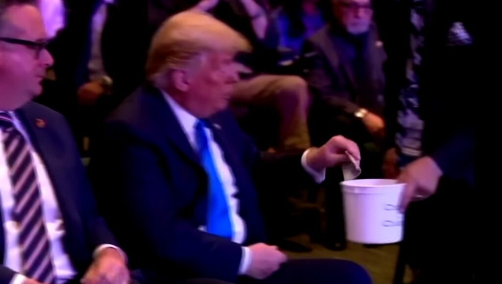 In the video, Trump is seen reaching into his pocket and pulling out some money of his own free will. There are no IRS agents nearby making sure he gives his fair share. Nobody even has a gun to his head. Then, entirely of his own volition, he puts the money in the bucket.