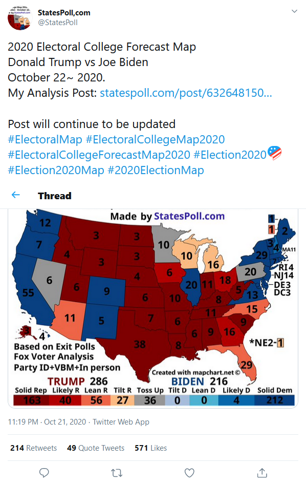 The election is pivoting on the Upper Midwest and Pennsylvania. Assuming he holds on to everything else he won on election night in 2016 Trump just needs to win one state in the group of Minnesota, Wisconsin, Michigan and Pennsylvania. Biden, under the same circumstances, has to sweep the field. Potential wild cards for Trump are Nevada, New Hampshire and Virginia. Potential wild card for Biden is Arizona where a pro-pot measure is attracting young voters.