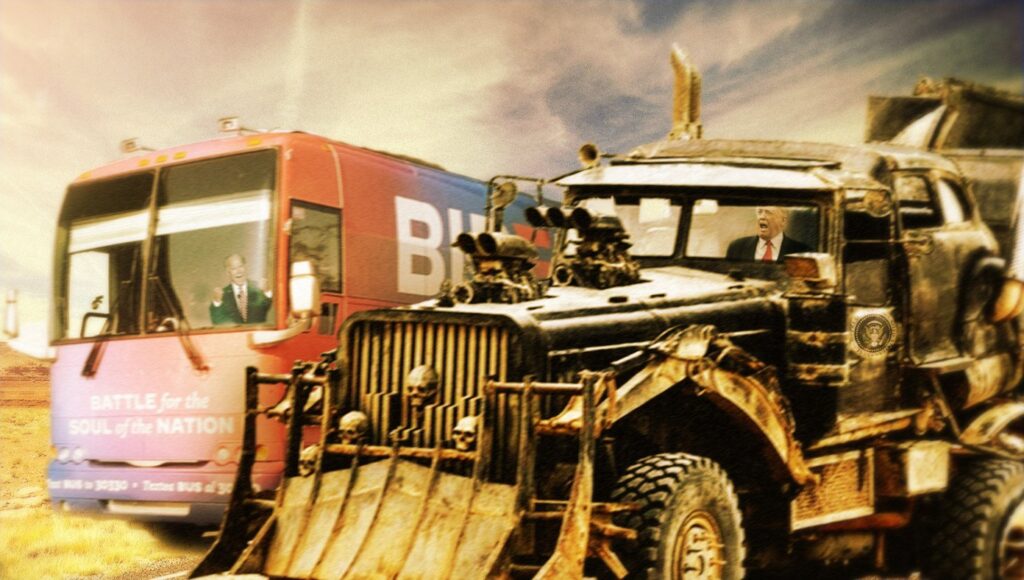 Trump leaped out of the War Rig onto his opponent’s bus, the president armed with a sawed-off shotgun. “I run for office! I win! I run again!” he cried as a frightened, screaming, and sleepy Biden curled up in a ball in the back of the bus.
