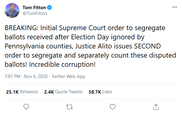 News on the radio reported on this with: “All of these ballots had been segregated in every county anyway, since those are the rules, so it is bizarre that such an order would be made. Justice Alito may be pandering to his Republican Base.”