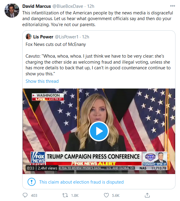 I’d like to add that I have nothing but contempt for Cavuto’s sanctimony and suppression of the news. That was the very opposite of journalism.