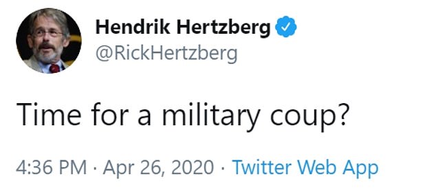 Go here to read the rest. Well Bee throughout his Presidency there have been calls by members of the so-called Resistance to have the military step in and remove a duly elected President. The use of the military to remove Trump to resolve a Constitutional crisis has already been proposed by two retired Colonels. Go here to read their open letter. If the military should be foolish enough to get involved in this mess, it will not be Trump who calls them in to kill our Republic.