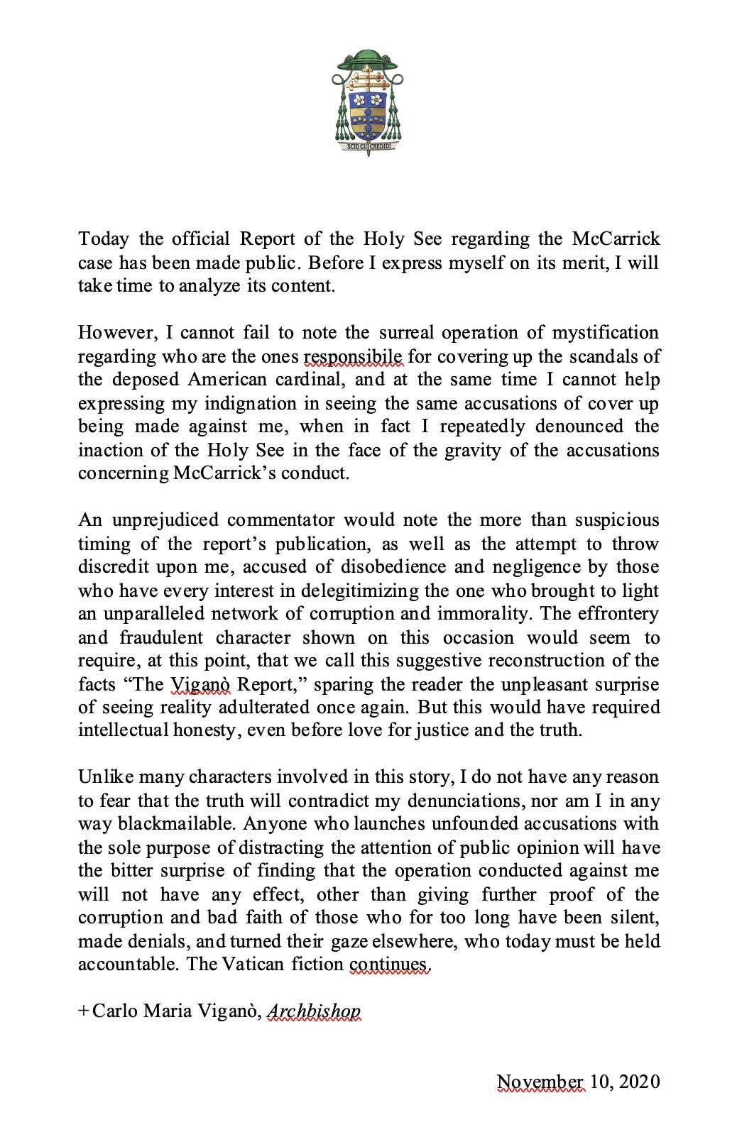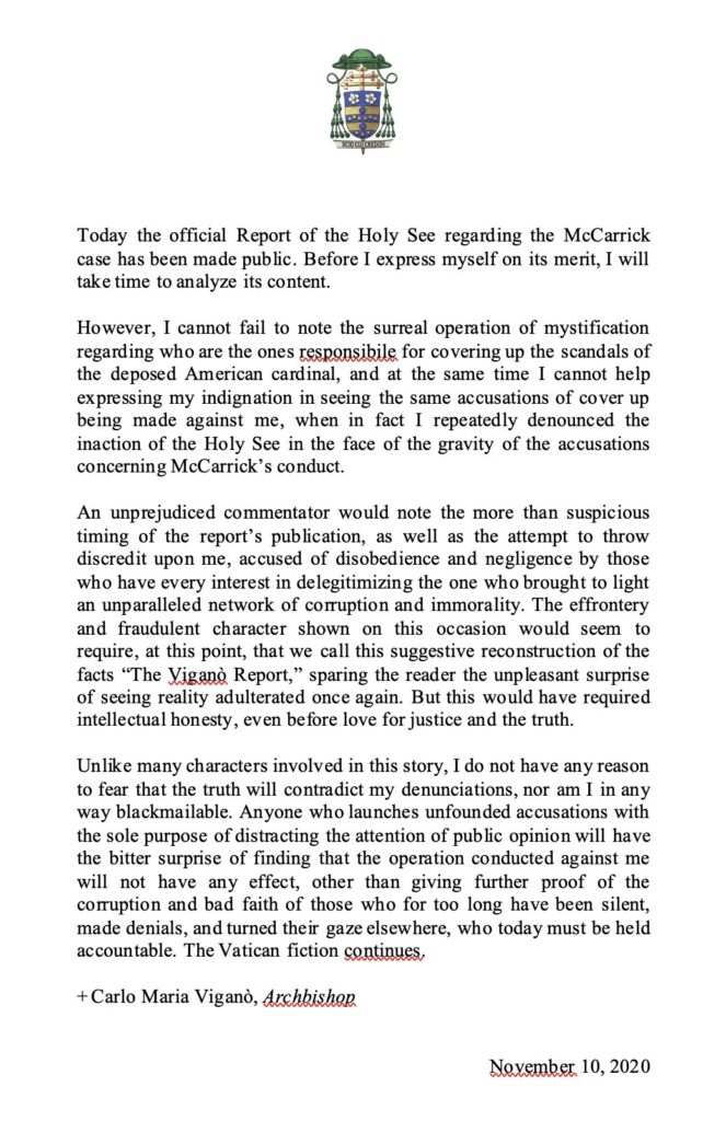 Archbishop Vigano gives an initial report to the McCarrick report: