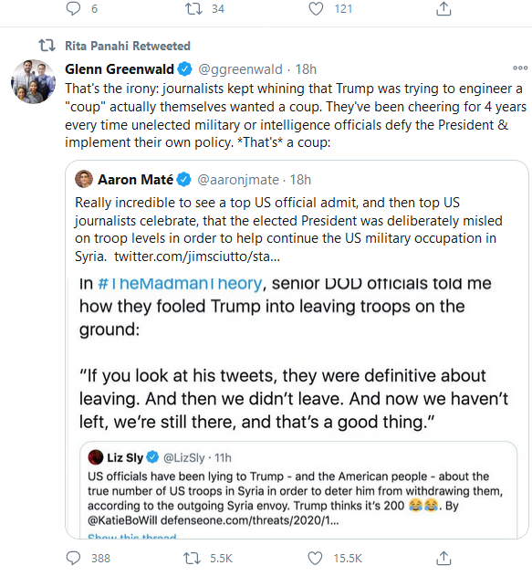 Among all the others, this now stands as a vital reason why the theft of this election must be defeated. When we have military brass openly bragging about lying to the Commander In Chief and getting away with it (which they will if Trump is not affirmed as the winner), we no longer have a military under civilian control. Hello, banana republic.