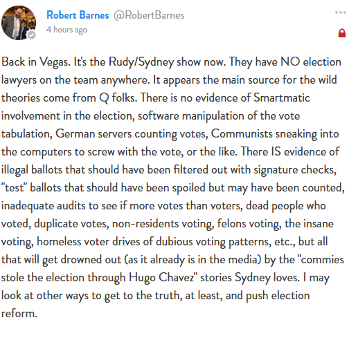 Not sure what’s up. I don’t think having the state legislatures replace the electors is a prudent way to right this unless you have satisfactory evidence of fraud that the public at large will acknowledge. That’s going to have to be established in court. They may have satisfactory evidence of the stuffing as well and this was obscured by their discussion of voting machines (which may also be corrupted). Also, I’d point out that there’s a difference between proof and between the sort of evidence courts have a habit of accepting as proof. IMO, statistical inference is powerful evidence if supplemented by exeplars like affidavits. Not sure lawyers in an occupation which emphasizes verbal intelligence and conventional epistemic rules will accept that.