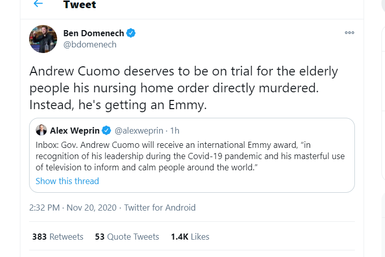 Go here to read the rest. When Cuomo gets his Emmy for the “documentary” on his Covid-19 leadership, he should really thank his able assistant the Grim Reaper without whose vigorous activity, under Cuomo’s direction, his Emmy would not have been possible.