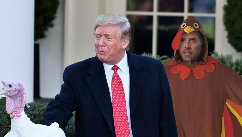 “Mr. Trump, I appeal to your greatness,” began Hunter. “Please pardon me for drug use, human trafficking, bribery, extortion, espionage, and corruption. Er — I mean… GOBBLE GOBBLE GOBBLE!”