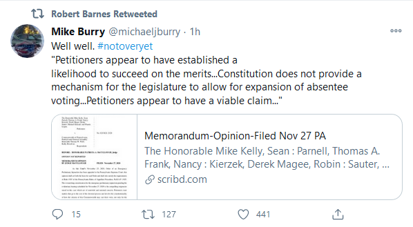 Don’t look now but a Pennsylvania trial court Judge has ruled that the way mail in ballots was handled is unconstitutional.  This is opening needed for the Republican controlled legislature to certify an alternate slate of electors.  There is now a not insignificant chance that this election could end up in the House.  Why?  Because there is good cause to believe that the Biden win was the product of fraud.  The Democrats have fought tooth and nail any attempt to examine the ballots in Milwaukee, Detroit, Philadelphia and Atlanta where victory was given to Biden with suspiciously high totals for Biden.  A lot of hoops for Trump to get over in order to get the election into the House, but it is no longer entirely impossible.