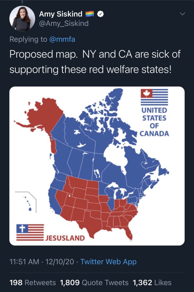 Back in the day before he was a paid shill, David Brooks noted that Republicans tend to prosper in loci where ‘the self is small’. The Democratic Party prospers in urban enclaves, 1st tier cities most of all. It makes it challenging to carve up the country regionally. In Canada, the left tends to prosper in greater Toronto, greater Vancouver, Quebec, and the country’s most peripheral areas. We separate