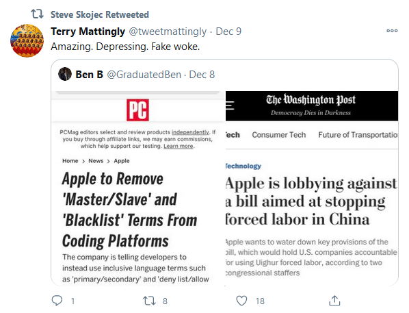 Easy to figure. Christian West and America bad. Country with massive potential consumer base good. As my boys noticed, if you convince Americans and Europeans that theirs is the most horrible and evil civilization in history, they won’t have any right to stand up to corporate interests aiming to cash in on countries like China or any others that are clearly not as bad as our civilization. But then Apple has been pretty open over the years about its ‘we’d throw America under the bus in a heartbeat if that’s where the money is’ philosophy.
