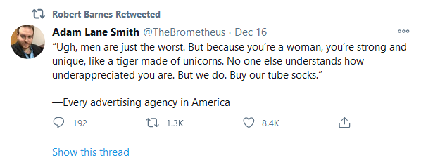Haven’t had network TV for over five years but I was recently at a relative who did. Saw some commercials that fit this template exactly, except with men being white men and women being black women.