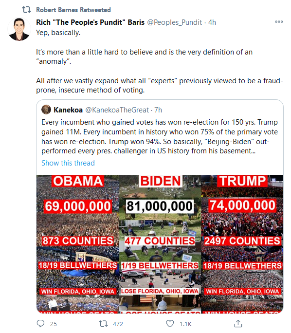 President Trump’s 11 million vote gain is the point to keep hammering as a starting point for voter fraud discussion.