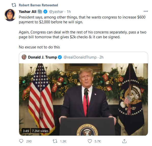 Congress found plenty of money for foreign countries, lobbyists and special interests while sending the bare minimum to the American people who need it. It wasn’t their fault, it was China’s fault. Not their fault. I am asking Congress to amend this bill and increase the ridiculously low $600 to $2,000 or $4,000 for a couple. I’m also asking Congress to immediately get rid of the wasteful and unnecessary items from this legislation and to send me a suitable bill or else the next administration will have to deliver a COVID relief package, and maybe that administration will be me, and we will get it done. Thank you very much.