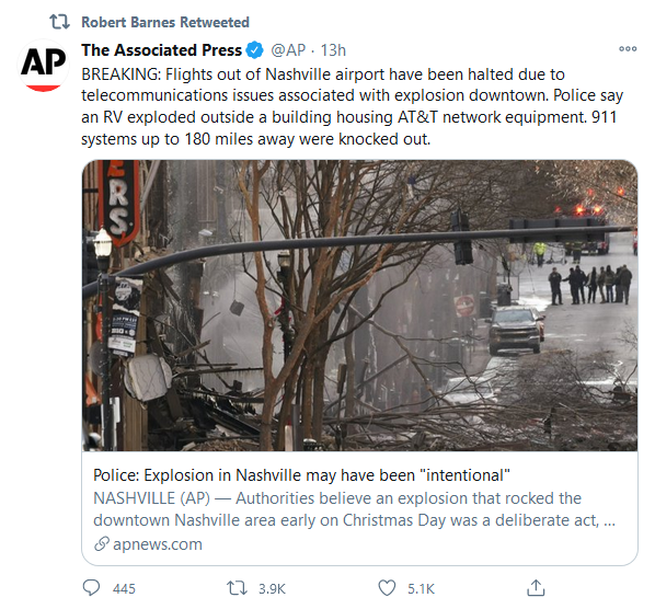 Absolutely baffling. There’s nothing political going on in Nashville – no recounts or anything. The warning signals seem to have been an effort to keep casualties to a minimum (and thankfully no one died).