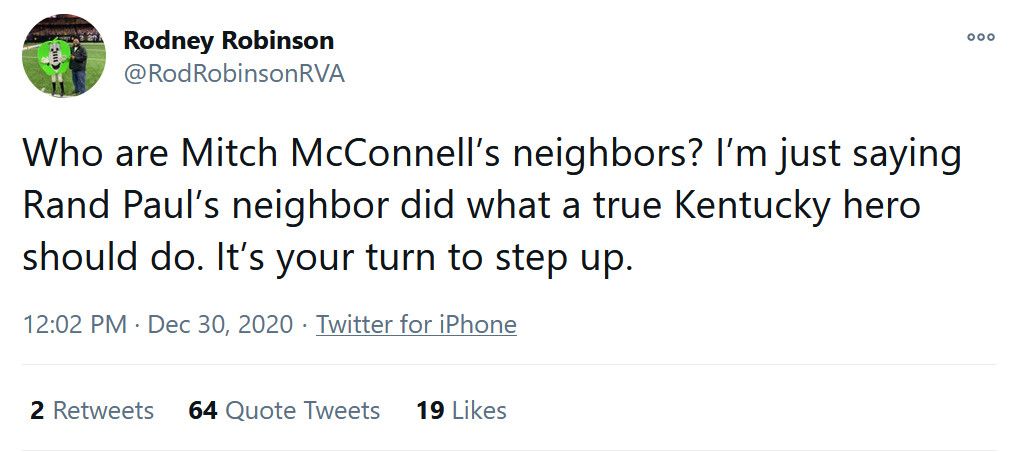 We had a former employee, a self described monk and talented carpenter, who sent an email to Sen. McConnell threatening the senator because he brought a bill to the floor that the “friar” thought hurt the poor. When an agent from the Capitol Police called me I had to explain that the “friar” was not in our employ or in the state; that he had no fixed address and was bicycling across the US; that he had an alcohol problem and appeared to have mental problems, i.e. visions. I had to forward every email I had received from him. I’m hoping that Rodney Robinson has or will be interviewed by a Capitol Police agent pronto. What Rod tweeted is worse than the “friar”s threat.