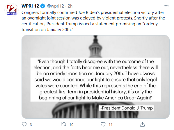 Heard today: Our President is being blocked from social media. The word is for 12 days. Maybe even after Trump is a private citizen unless he behaves himself.