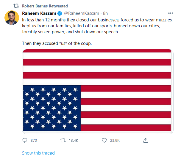 “In less than 12 months they closed our businesses, forced us to wear muzzles, kept us from our families, killed off our sports, burned down our cities, forcibly seized power, and shut down our speech.”