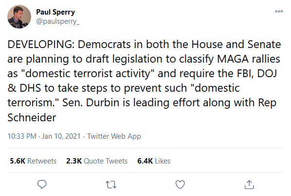 Because the Dems have decided to whip up hysteria over the Capitol Hill Riot, which they and their propagandists, erroneously called the Media, frame as an “insurrection”, in order to criminalize their political adversaries as “domestic terrorists”. In short they wish to use the Capitol Hill Riot as a Reichstag Fire and pass their own version of the Reichstag Fire Decree depriving their adversaries of civil rights. The Silicon Valley move of purging conservatives from the Internet is right in line with the banning of opposition newspapers under the Reichstag Fire Decree. That this is insane and will provoke opposition that will shake the foundations of this country is apparently of no consequence to the Dems. The Dems are about to learn that this country is not a college campus writ large where a speech code can be imposed and conservatives silenced.