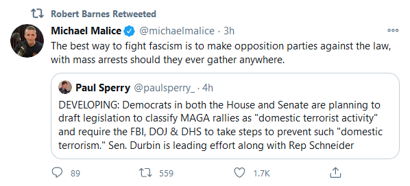 Now the Democrats want to declare us MAGA supporters terrorists. Where do you think this is going to end? Peacefully? And how long till blogs like our TAC are removed for being subversive? Why is violent action by BLM & Antifa acceptable, but all of conservativism takes the blame of a few score of people who broke into the Capitol building on January 6th? And why is a policeman’s death in defending that building against supposedly MAGA protesters such a tragedy, but murder of policemen (and police women) by BLM & Antifa is acceptable? And remember Ashli Babbitt, an Air Force veteran. What of her death at the discharge end of a policeman’s handgun? Why isn’t she a martyr and heroine as drug addled, woman-beater, criminal George Floyd has been made a martyr and hero?