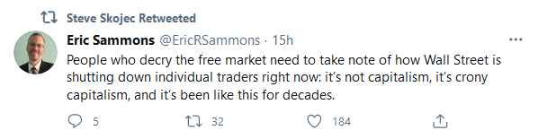 The outcry amounts to “a stock we decided should fail is going up, and that’s unfair.” So now we see basically every trading application and media outlet openly collude to make it go back down. “Free” market indeed.