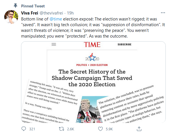 It’s depressing, though not terribly surprising, how many people insist that there is nothing objectionable about the Time article because they say it was bipartisan and for our own benefit (though, as Viva Frei notes, you barely have to read between the lines to see that this wasn’t true.)