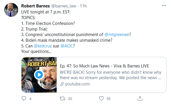 6:00 PM CST February 8, 2021. Delayed a day due to the Super Bowl. Barnes has joined the legal defense team of Kyle Rittenhouse. I find these two gentlemen to be the most insightful of the many commenters I read on a regular basis.