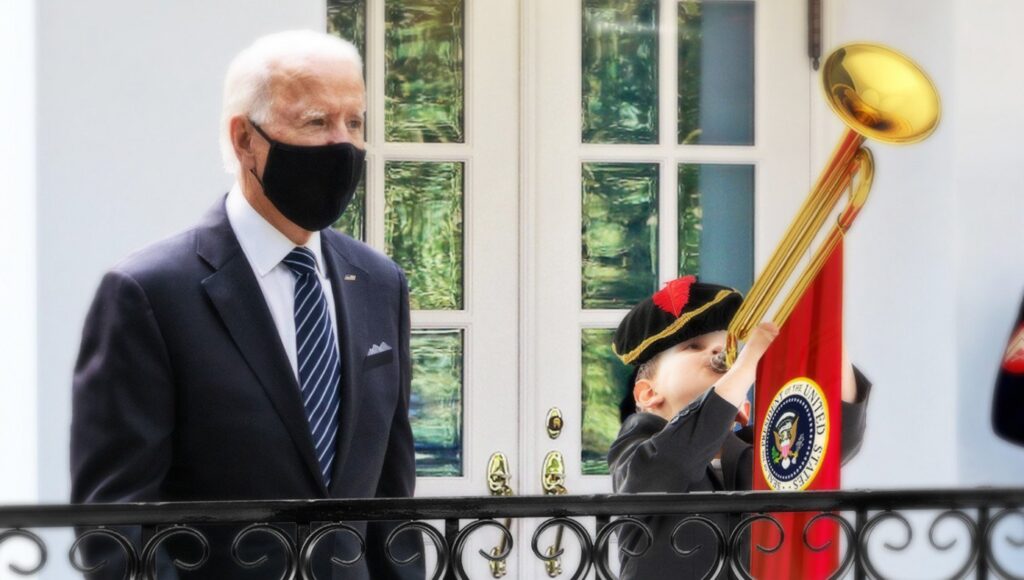 WASHINGTON, D.C.—Reporters rushed to the White House lawn today as they heard a familiar sound: the trumpeting of the Biden administration’s official herald, Timmy Johnson. Johnson stood on the White House balcony and blasted the notes that signaled another royal decree from President Joe Biden