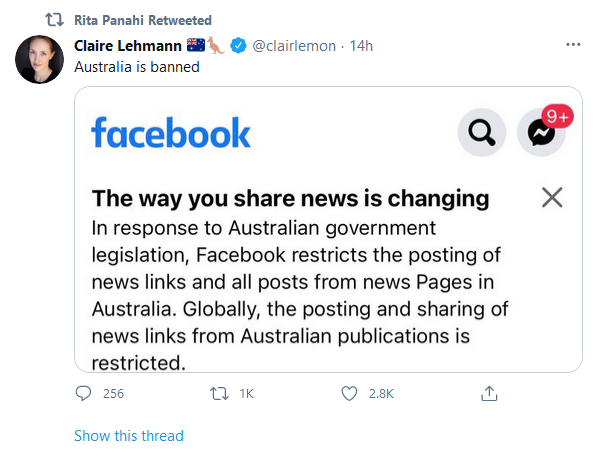 They have been planning this for months. Their own employees in Australia didn’t even have the heads up on it. A low-life organisation. The good news is that My 13 year old said to me today: who still uses Facebook, it’s for dinosaurs. Maybe Facebook time is up.