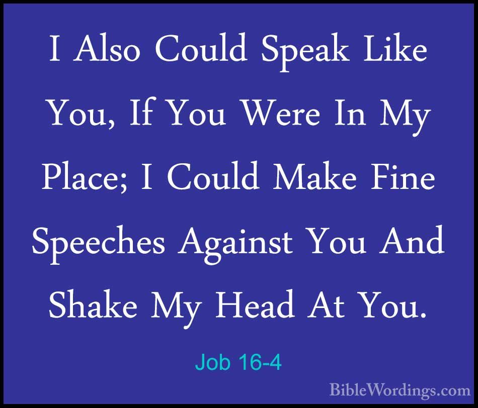 He shows in what follows that there is not equality on both sides in this dispute because the friends of Job spoke without being troubled, and so he says, “What trouble is there for you if you speak?” as if to say: You speak for such a long time in deprecating me because you are not troubled by this situation. Job, however, was annoyed. To preclude anyone thinking that ease in argumentation was attributed to the prominence of the friends in knowledge, Job shows that if adversity had not deprived him and he were in the condition of the friends, he would speak with the same confidence. So he says, “I myself could also speak like you,” if I were not weighed down with adversity. He wants for them the opportunity to feel the same thing as he does saying, “would that your souls were in place of mine,” in that you suffered the adversity I do. He does not say this because of a feeling of hatred or with ill will seeking revenge, but to recall them from the cruel approach they were using in exasperating Job by their words when they realized that similar words would be rough on them if they were spoken to them. So he then says, “I too would console you with words,” like those which you used to console me, “and I would shake my head over you,” as a sign of compassion or reprobation like you censure me. Also, “I would encourage you with my mouth,” lest you should despair in your impatience, “and I would move my lips,” to speak, “and appear to console you,” by pretending to speak from pity which I had for you, just as you are doing to me.