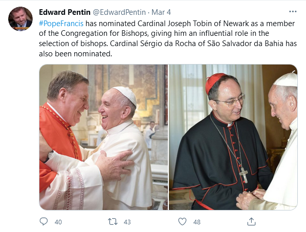 George, It was from Tobin himself. He, through his Chancery, clarified that he was texting his sister. No one believes him. I may be mistaken, but I think he was still “just” and Archbishop at the time, and and afterwards promoted to a Cardinal.
