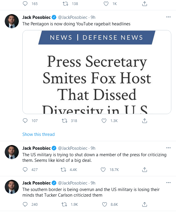 Pentagon brass took time away yesterday from their busy schedule of dreaming up excuses for why they lost the coming war with China to attack Tucker Carlson for saying some unpleasant truths about our politicized military. The Left destroys everything it touches and the US military is thoroughly infected with their poison. Politicized militaries tend to be good for suppression of dissident populations but much less effective at winning foreign wars. I predict that the Democrat Military will be pretty ineffective at both.
