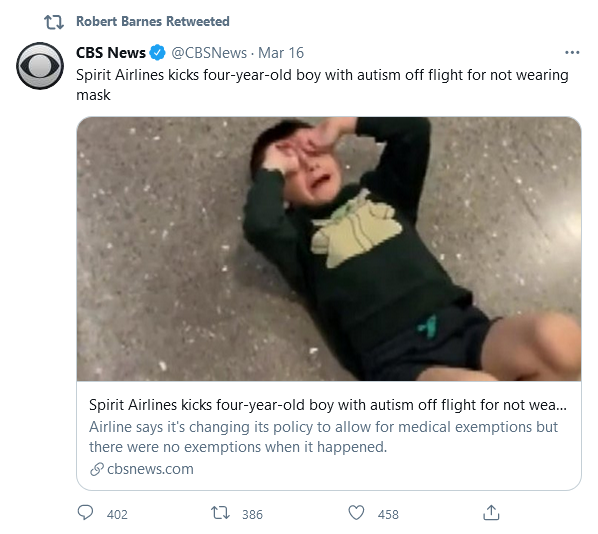 There is indeed some uncertainty as to whether (or the extent to which) a youngster his age can spread the virus if he is carrying it, but that uncertainty should cut in favor of safety for third parties. I have no problem believing that the airline and flight attendant might have handled this imperfectly — even poorly — but the protocols are reasonable and worthy of general enforcement. I’m open to exceptions and alternative protocols, but simply suggesting that third parties must bear the risk of spread from children at least if they are autistic does not seem reasonable to me.