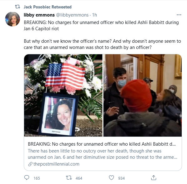 If I were Ashli Babbitt ‘s mother I would demand a copy of the investigation. Maybe the family has asked and been told to shut up. There has been no release of a quote by the police officer as to why he pulled a gun on the unarmed woman and fatally shot her. The Capitol Police haven’t released his name for fear of death threats, I’m guessing. The only fire arm used in the so called insurrection. According to stats kept by WAPO more unarmed whites are fatally shot by police than unarmed blacks. For Mrs. Babbitt it is just here today, gone tomorrow. Poof!