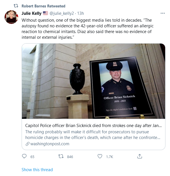The ME says HIPPA prevents him from discussing Sicknick’s medical history. We’d benefit if the Sicknick family got his regular doctors to cough up the files and cleared the air on this point. (Betting his problem was atrial fibrillation).