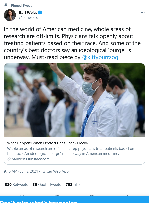 Go here to read the rest. When doctors are determining medical treatment on the basis of race, we are confronting a full blown totalitarian movement eager to impose a racial caste system on our country for the purpose of Leftist domination and too many brain washed young people are all in favor of it.