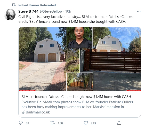 Last year in the midst of the BIG LIE about career felon George Floyd’s overdose death, scores of US corporations sent BLM uncounted millions of dollars. That’s how this petty criminal has all the cash to buy a house where black people don’t live.