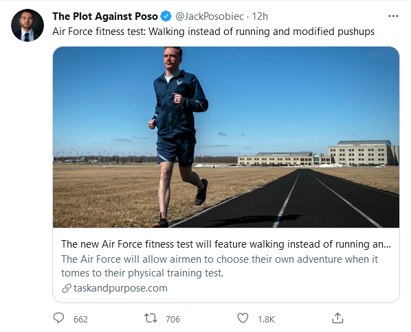 When I was in the Green Machine back at the dawn of time, I always hated PT, which probably was a good measure of just how effective it was. If you are going to be in the military physical fitness is not a luxury extra but something that can save your life and the life of others in a crisis moment. Apparently the woke military knows better. This does remind me of a quote I have heard about the Air Force, that it is almost like being in the military.